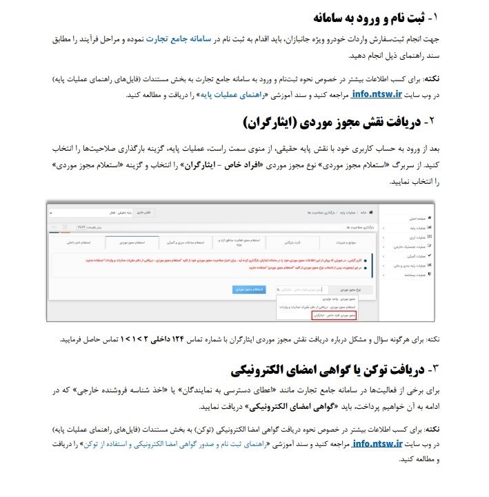در گام نخست جهت انجام ثبت سفارش واردات خودرو ویژه جانبازان، باید اقدام به ثبت نام در سامانه جامع تجارت نموده و مراحل فرآیند را مطابق سند راهنمای ذیل انجام دهید.